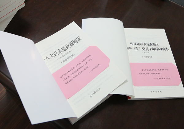 活動中,向副科級以上干部、各黨支部書記每人贈送了《作風建設永遠在路上—“三嚴三實”黨員干部學習讀本》、《十八大以來廉政新規(guī)定(最新修訂版)》兩本書籍,并附上溫馨的讀書月活動贈言。同時,要求大家把這兩本書作為重要思想行動指南,認真學習,用正確的理論武裝頭腦,深入踐行“三嚴三實”精神,堅定理想信念,增強黨性修養(yǎng),提升實干精神,筑牢防腐拒變的思想防線。這次活動也將對區(qū)研院經(jīng)濟健康發(fā)展發(fā)揮積極作用。(胡劍瀟/文)